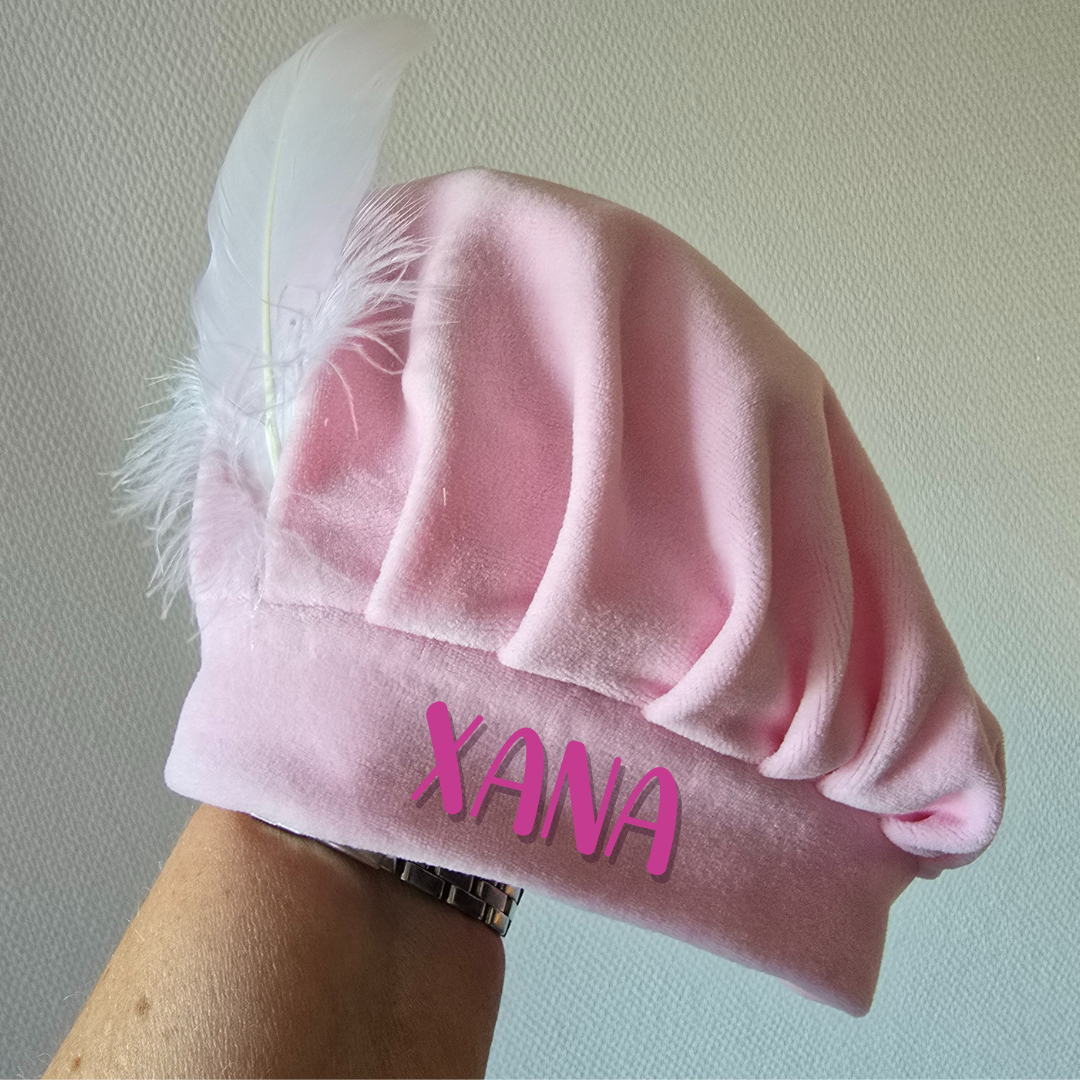 De pietenmuts lichtroze met naam is afgezet met een mooie band rondom, waarop je de naam van je ukkepuk kunt laten zetten, en afgemaakt met een mooie witte veer!